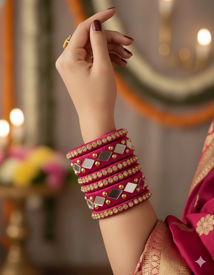 Elevate your traditional ensemble with this exquisite set of silk thread bangles in stunning pink. Each bangle showcases intricate craftsmanship with beautiful golden beaded embellishments and mirror-like diamond-shaped accents. The set features multiple bangles adorned with alternating patterns - some decorated with glistening golden beads arranged in a continuous pattern, while others feature striking metallic diamond shapes interspersed with golden studs. The vibrant pink silk thread wrapping provides a luxurious finish and ensures comfortable wear. These bangles measure 8 centimetres in length with a thickness of 0.5 centimetres, making them perfectly sized for most wrists. Crafted from brass with gold plating, these bangles offer a perfect blend of traditional aesthetics and contemporary style. The slip-on design makes them easy to wear, while the lightweight construction ensures comfort throughout the day. Perfect for festivals, weddings, and traditional celebrations, these bangles can be paired with both traditional Indian attire and modern outfits for a sophisticated look. |