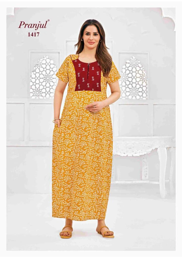 Experience comfort and elegance with the Pranjul 1417 Women’s Printed Cotton Gown. Crafted with soft, breathable fabric, this gown is perfect for daily wear, maternity wear, or night wear. The beautiful mustard yellow floral print combined with a contrasting maroon yoke adds a stylish touch, making it both comfortable and fashionable. Features: