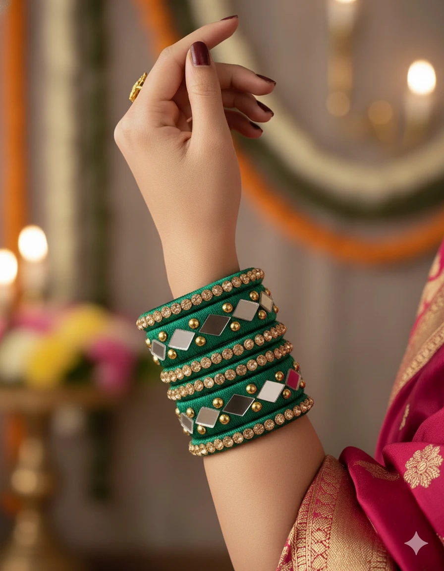 These elegant green thread bangles are handcrafted with premium silk thread and decorated with sparkling golden studs and diamond-shaped mirror embellishments. The vibrant green color paired with gold accents gives a rich, festive look suitable for traditional outfits as well as modern ethnic wear. Each bangle is smoothly wrapped for comfort and designed with durable materials to ensure long-lasting shine. Perfect for weddings, festivals, parties, or gifting. |