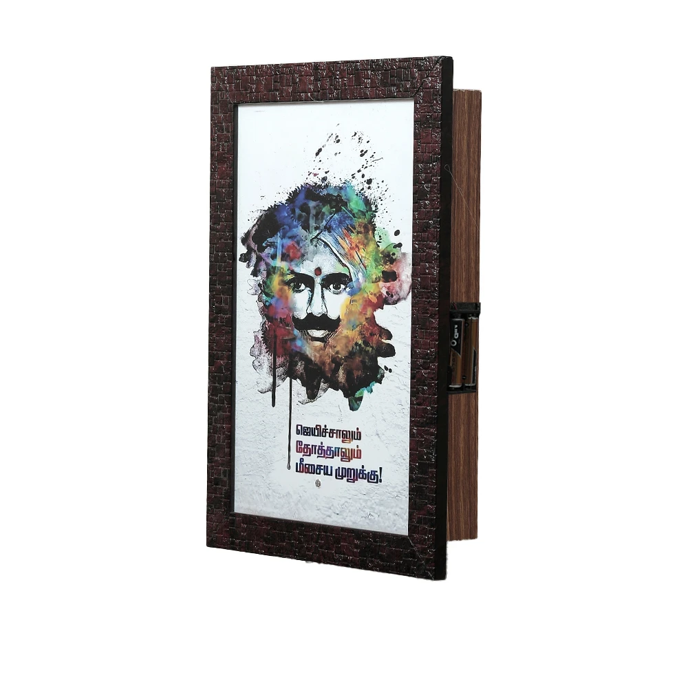 Whenever light falls on Bharathiar photo a motivational quote will play ஒவ்வொரு முறையும் பாரதியார் புகைப்படம் மீது வெளிச்சம் பட்டால் அவர் கூறிய வெற்றி மொழிகள் இசைக்கும். 1. நான் வீழ்வேன் என்று நினைத்தாயோ 2. தோத்தாலும் ஜெயிச்சாலும் மீசைய முறுக்கு |