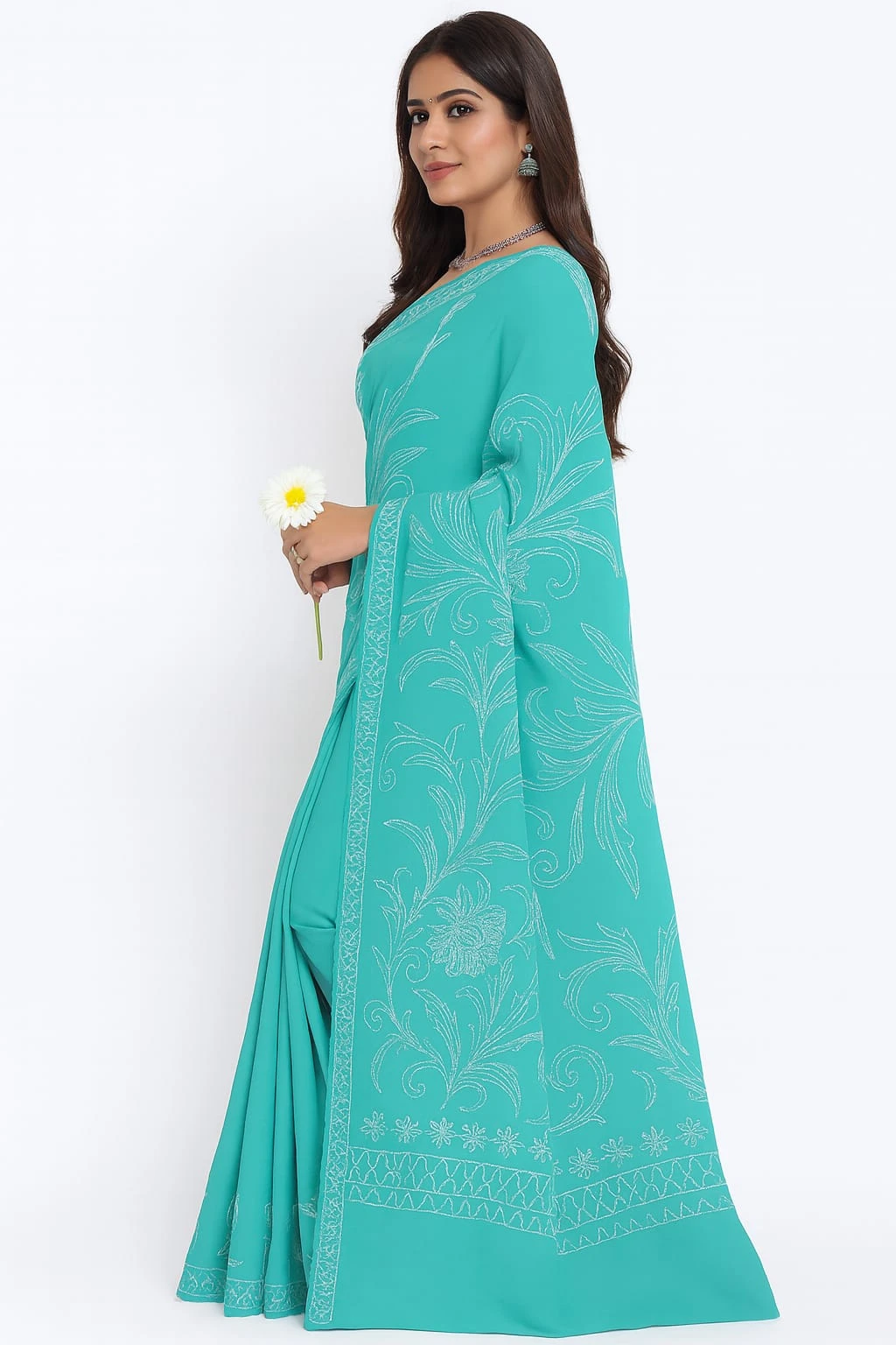 Step into elegance with this stunning Sea Green Embroidered Saree. Designed with beautiful floral thread work and a soft lightweight fabric, it’s perfect for festive occasions, functions, and daily wear. ✨ Fabric: Soft Georgette / Synthetic Blend ✨ Work: White Thread Embroidery ✨ Blouse Piece: Not Included ✨ Occasion: Party, Festive, Traditional, or Casual Wear ✨ Care: Gentle Hand Wash 5.50.meter |
