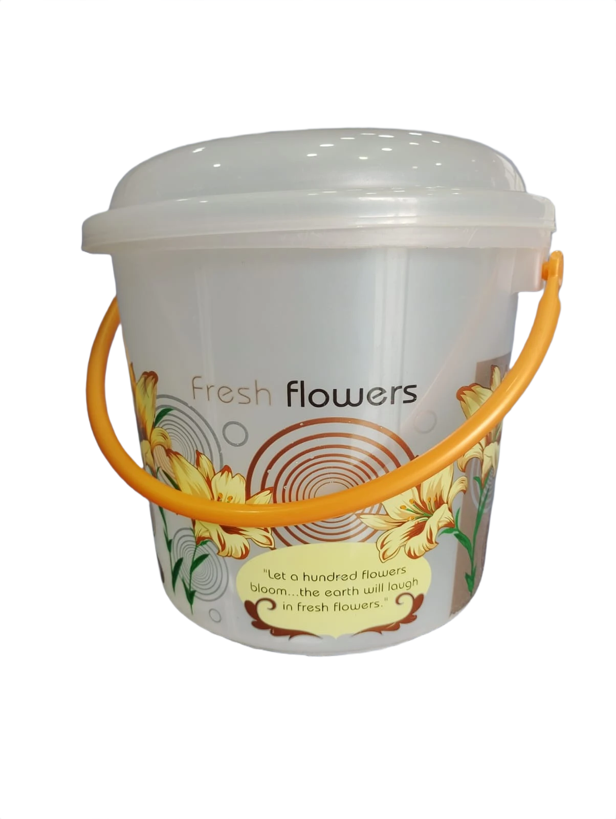 This plastic bucket is useful for everyday storage. It is made from strong plastic and is easy to carry. The bucket comes with a lid that keeps the items inside safe from dust and dirt.