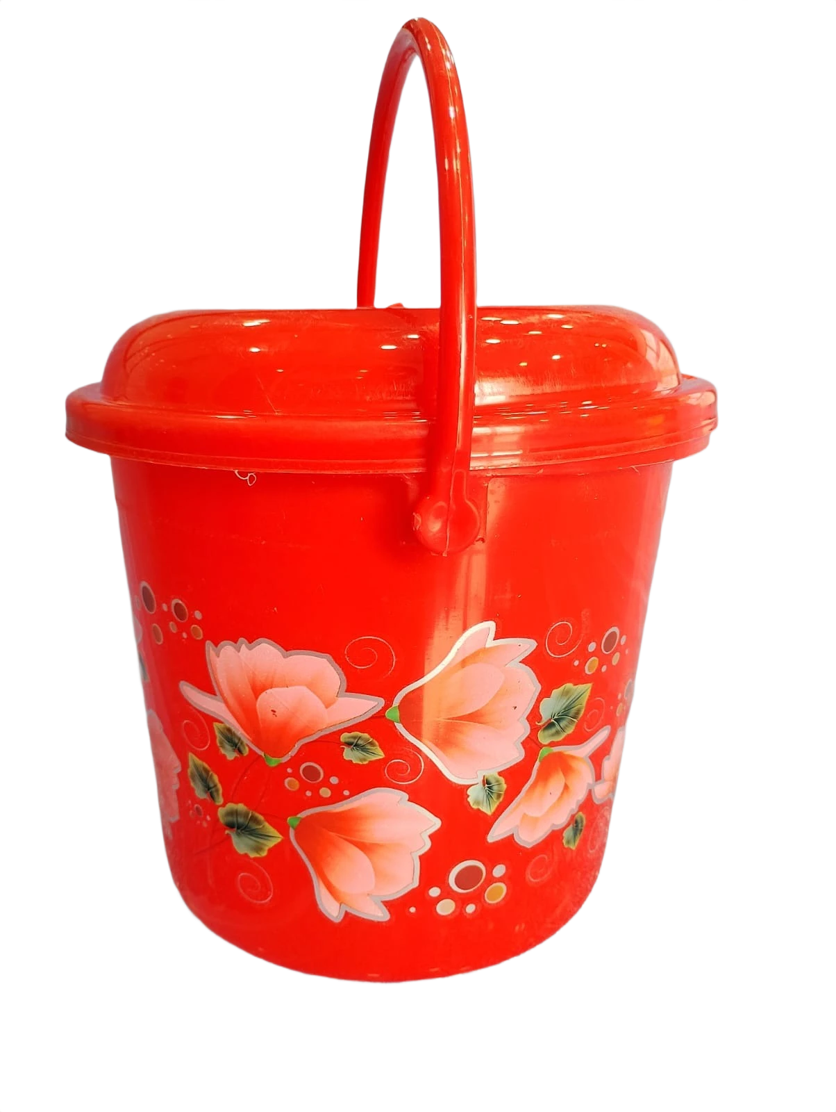 This plastic bucket is useful for everyday storage. It is made from strong plastic and is easy to carry. The bucket comes with a lid that keeps the items inside safe from dust and dirt.
