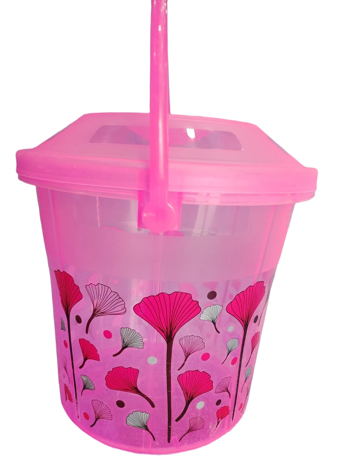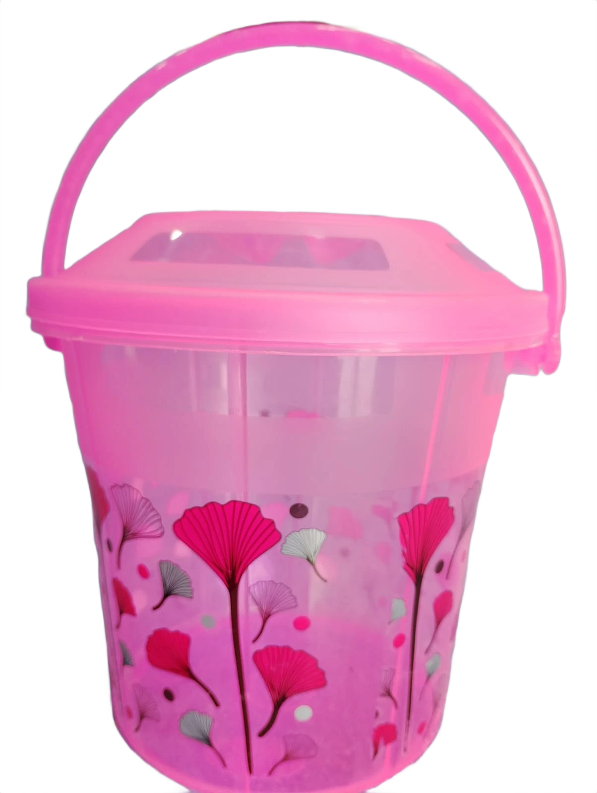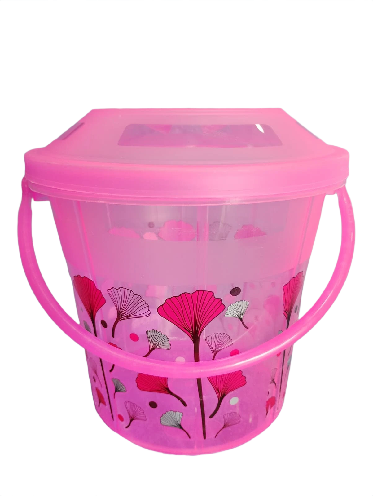 This beautiful pink plastic bucket is perfect for daily home use. It comes with a secure lid to keep items safe from dust and a strong handle for easy carrying. The bucket has a stylish floral print, making it attractive as well as useful.