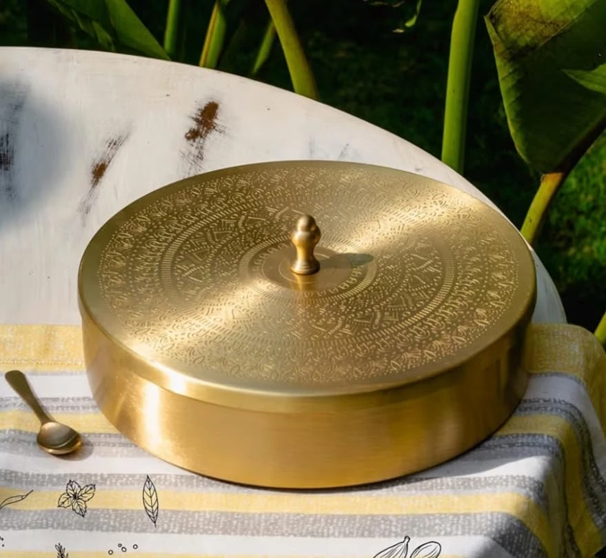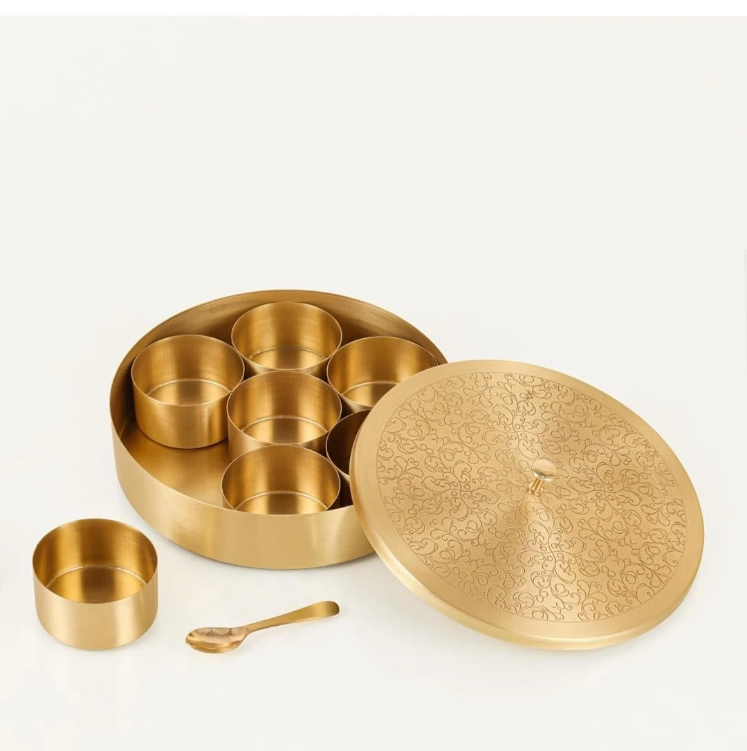 Premium Golden brass Masala Spice Box Set with Decorative Lid, 7 Storage Contain